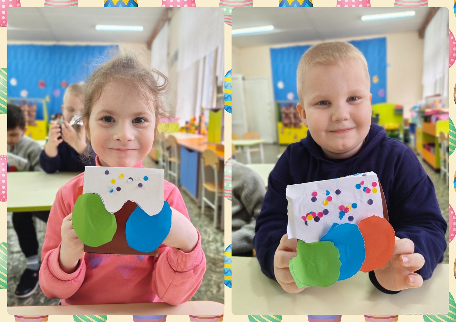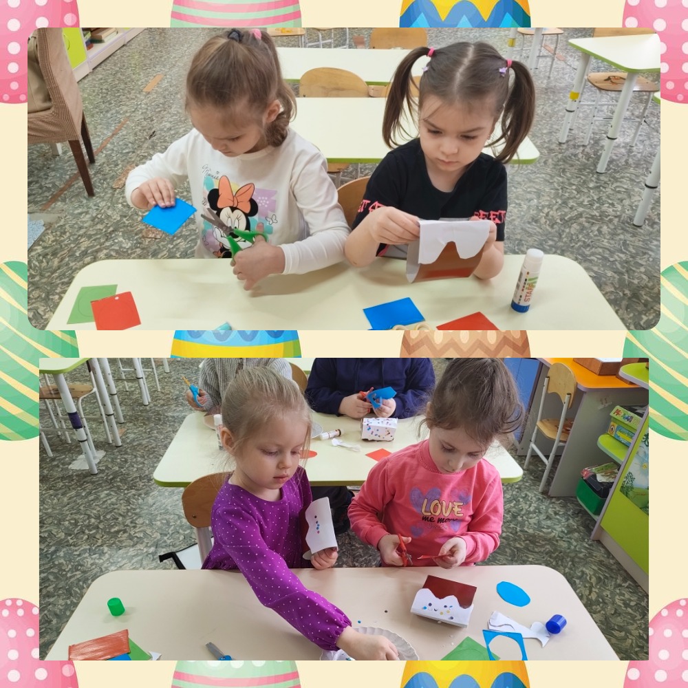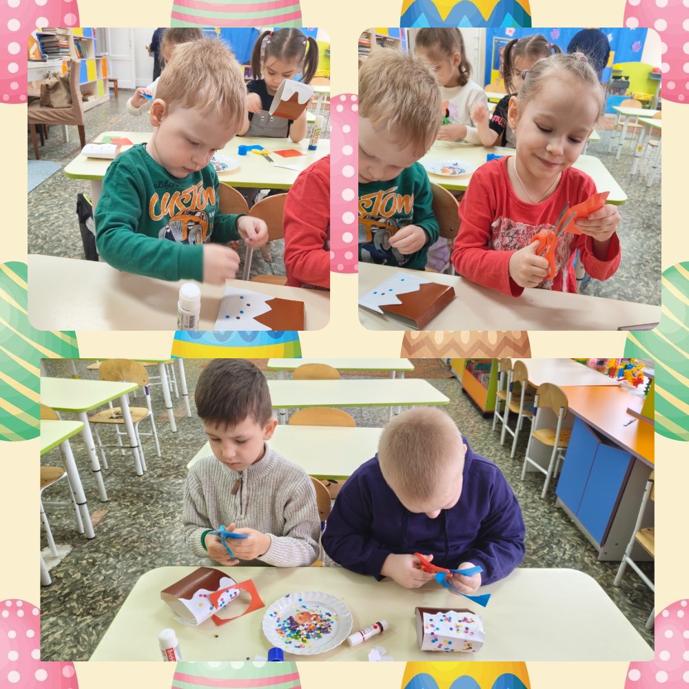 А затем взяли в руки картон, цветную бумагу, ножницы и клей и отправились творить. На занятии по конструированию каждый сделал свою пасхальную композицию — аппетитный кулич с сахарной глазурью и разноцветные яички.