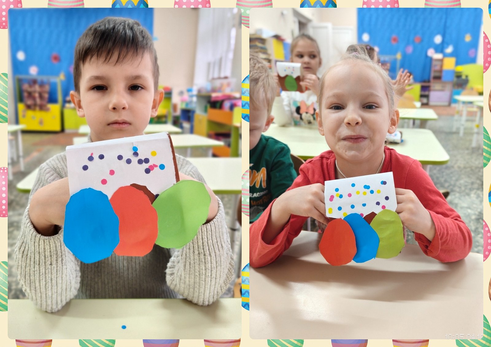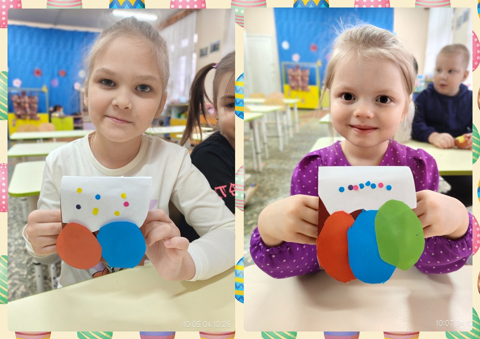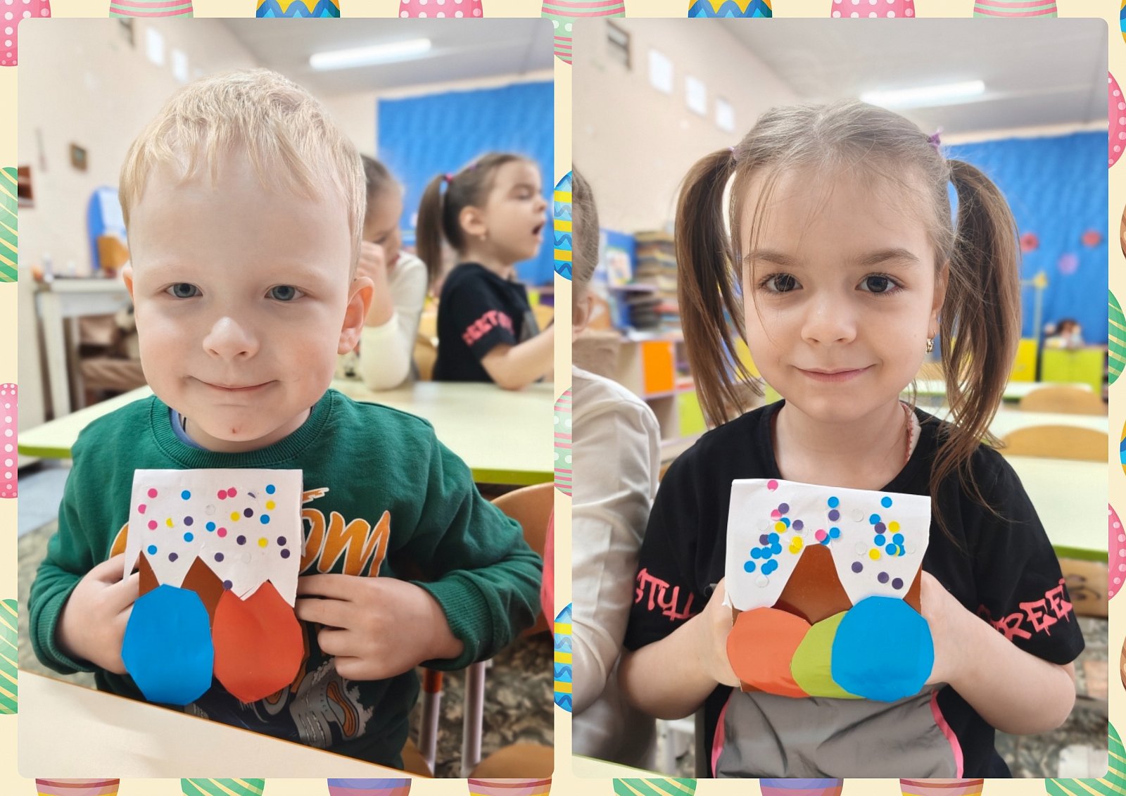 А затем взяли в руки картон, цветную бумагу, ножницы и клей и отправились творить. На занятии по конструированию каждый сделал свою пасхальную композицию — аппетитный кулич с сахарной глазурью и разноцветные яички.