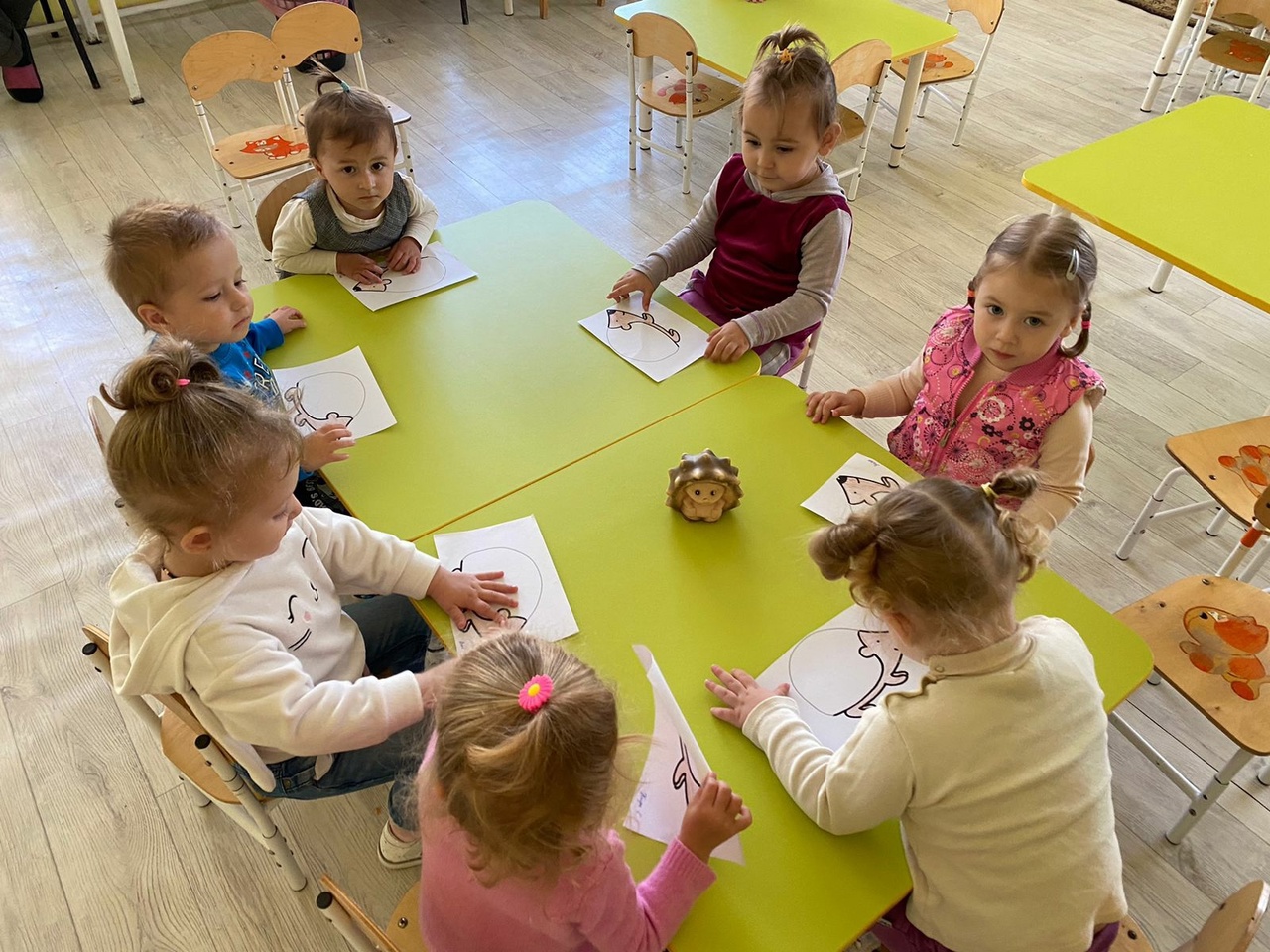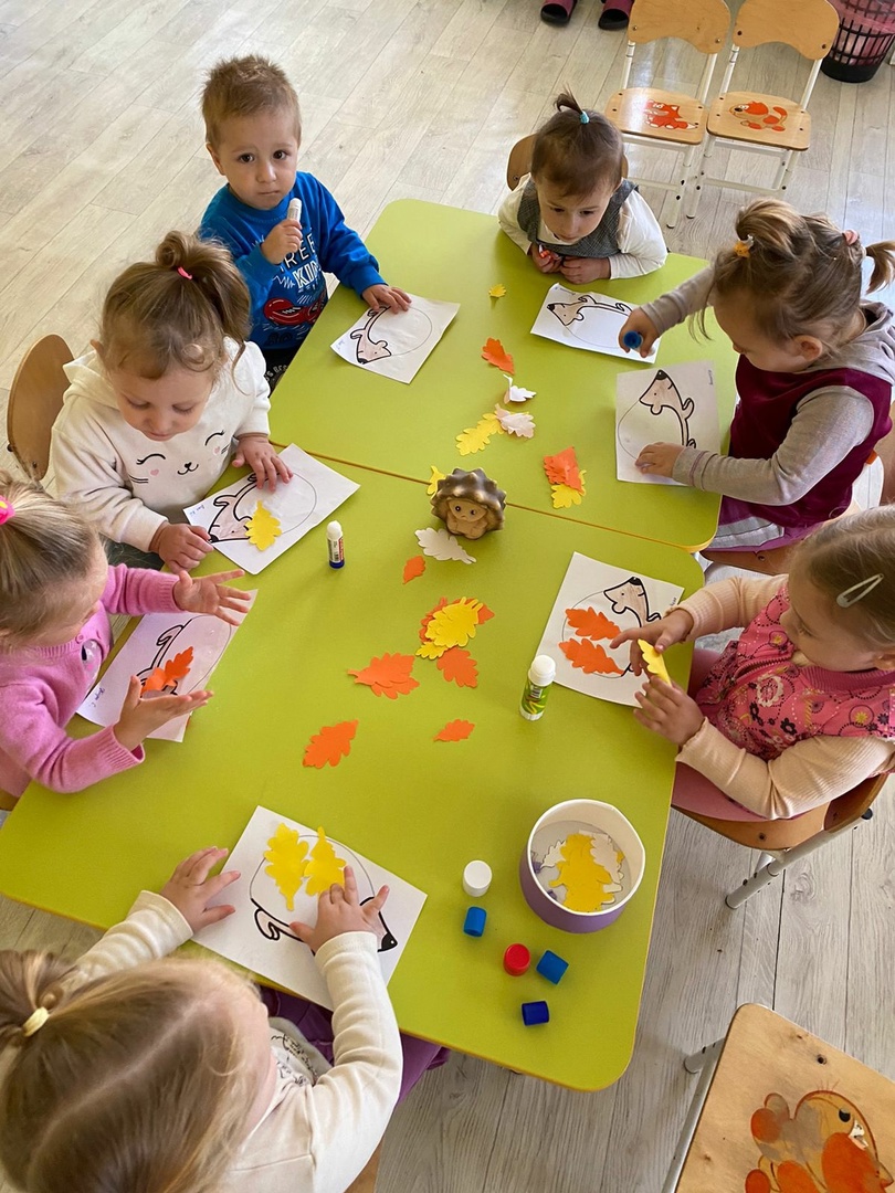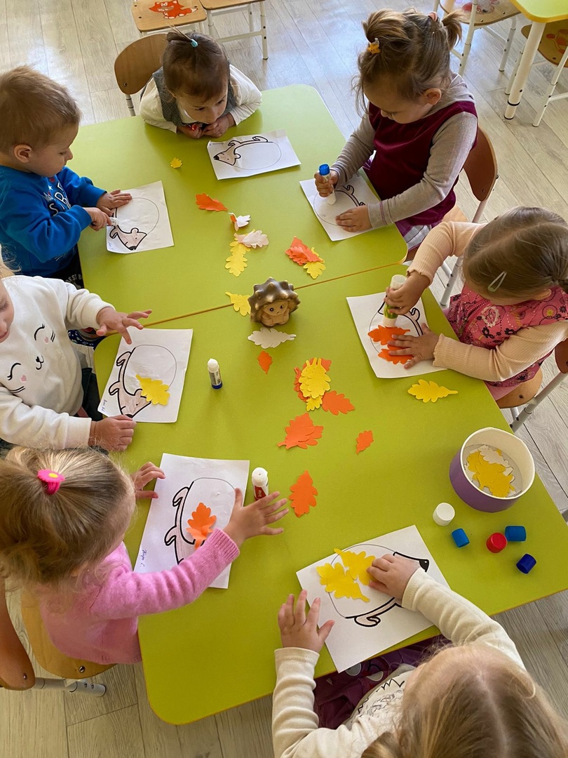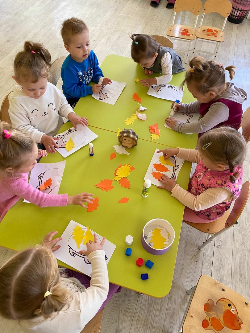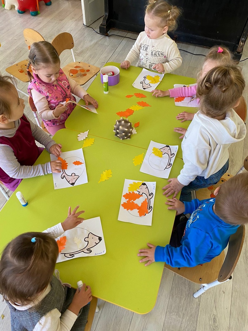 Ребята с увлечением и энтузиазмом наклеивали разноцветные листочки жёлтого и оранжевого цвета на спинку ежа.